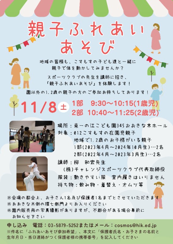 2025年10月17日 親子ふれあいあそび 012こすもす園児と一緒に親子ふれあいあそびをしませんか?1・2歳児のお子様と保護者が対象です。詳しくはこちらをご覧ください。 ※クリックすると拡大して表示されます 一覧に戻る